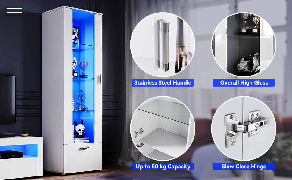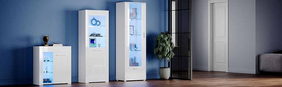 The ELEGANT White High Gloss Sideboard is a modern tall display cabinet measuring 187x60x40 cm, featuring a high gloss MDF front and matte chipboard body. It includes three glass shelves behind a transparent acrylic door and multi-color LED lighting with remote control, making it a versatile and stylish storage and display solution for contemporary living rooms.